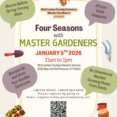 Four Seasons with Master Gardeners: There will be four breakout sessions with demonstrations focusing on the following topics: African Violet propagation, forcing bulbs, spring seed sowing, and winterizing tools. Lunch will be provided with chances to win door prizes!